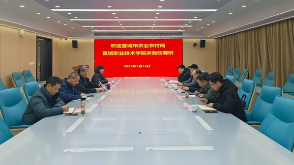 1月14日,宣城市農(nóng)業(yè)農(nóng)村局副局長、市委農(nóng)辦專職副主任鮑猛、宣城市農(nóng)業(yè)農(nóng)村局經(jīng)改科科長孟超峰,宣城職業(yè)技術學院建筑藝術系黨總支書記茆欣荷一行五人到安慶職業(yè)技術學院調(diào)研鄉(xiāng)村振興學院工作。安慶職院黨委副書記李克讓,安慶市農(nóng)業(yè)農(nóng)村局副局長楊傳斌熱情接待,調(diào)研組一行。