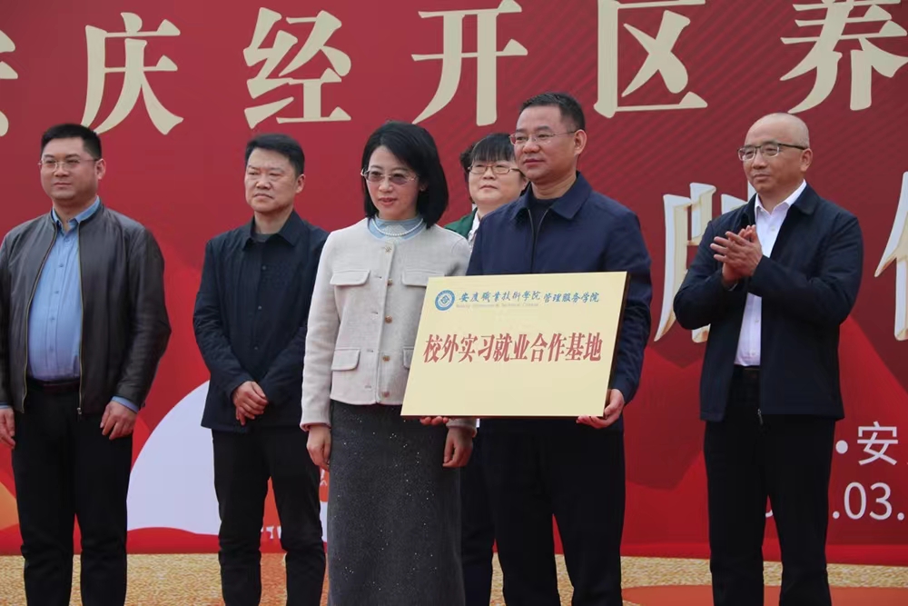 為更好地服務(wù)安慶地方養(yǎng)老事業(yè)發(fā)展,促進(jìn)養(yǎng)老人才留宜,擴大校企合作覆蓋面,3月1日,安慶職業(yè)技術(shù)學(xué)院管理服務(wù)學(xué)院與安慶市經(jīng)開區(qū)養(yǎng)老服務(wù)中心正式舉行校企合作基地揭牌儀式。市民政局局長蔡婷婷,經(jīng)開區(qū)黨工委委員、管委會副主任畢圣國,市醫(yī)保局副局長李愛斌,市衛(wèi)健委黨組成員、辦公室主任孔軍出席活動。安慶職院管理服務(wù)學(xué)教學(xué)工作負(fù)責(zé)人代表該院與老峰鎮(zhèn)黨委書記陳士兵共同為經(jīng)開區(qū)養(yǎng)老服務(wù)中心“校外實習(xí)就業(yè)合作基地“揭牌。