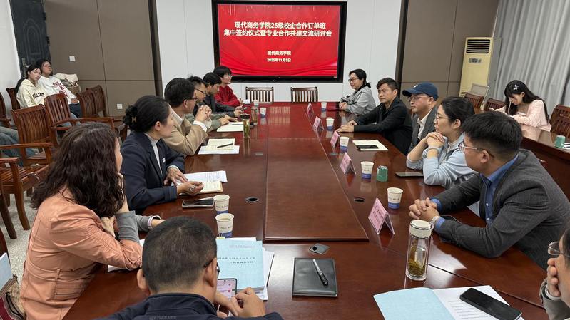 11月5日,安慶職業(yè)技術(shù)學(xué)院現(xiàn)代商務(wù)學(xué)院在3號(hào)教學(xué)樓510會(huì)議室舉行校企合作訂單班集中簽約儀式,來自安慶本地的安徽云霽電子商務(wù)有限公司、安徽星虹信息技術(shù)有限公司、安徽源潭柯林沃德刷業(yè)科技有限公司、安徽際通物流有限公司、安慶和君縱達(dá)數(shù)據(jù)科技有限公司五家企業(yè)相關(guān)負(fù)責(zé)人齊聚一堂,共同簽約并交流?,F(xiàn)代商務(wù)學(xué)院院長金啟勝出席儀式,該院教學(xué)工作負(fù)責(zé)人、學(xué)生工作負(fù)責(zé)人、專業(yè)負(fù)責(zé)人、訂單班輔導(dǎo)員以及訂單班學(xué)生代表參加活動(dòng)。